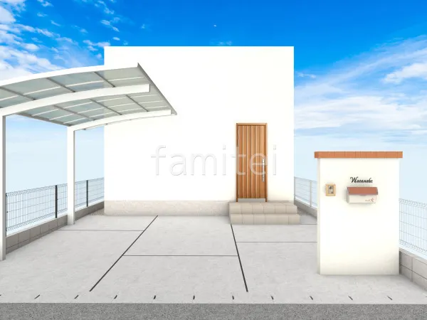 家の外壁に合わせた白い塗り壁門柱がかわいい外構です。郵便受けはディーズガーデン スタッコUを採用。やわらかで可愛らしいポストが家のイメージにピッタリです。インターホンカバーにはディーズガーデン C13を使用し、こちらも外構イメージの構築に一役買っています。